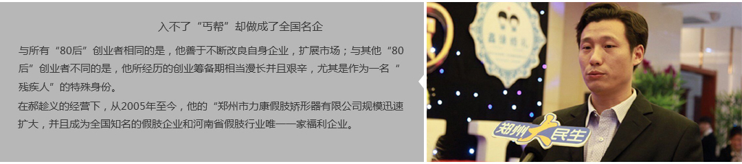 鄭州市力康假肢矯形器有限公司(簡稱力康),是一家專業從事假肢矯形器的設計、研發、制作及裝 配的專業機構。成立于1992年是河南省唯一一家福利企業。力康下設業務部、技術部、住院部、康復 部、售后服務部,并配有現代化的裝配車間和功能齊全的訓練大廳,為殘疾朋友康復訓練提供了可靠 保障。總經理穿戴假肢多年,有著豐富的臨床經驗和親身體會;多年來,力康已為全國幾十萬名殘疾 朋友安裝上舒適、美觀、耐用的假肢和矯形器具,使他們更大限度地恢復了正常的工作和生活。“產 品即人品”的質量理念、先進的技術、實惠的價格、完善的售后服務是力康取勝的法寶……